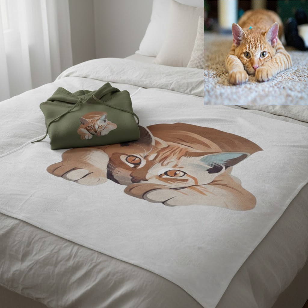 Upload a photo of your furry friend and we'll transform it into a stunning cartoon portrait. Printed on premium hoodies, t-shirts, mugs and more.